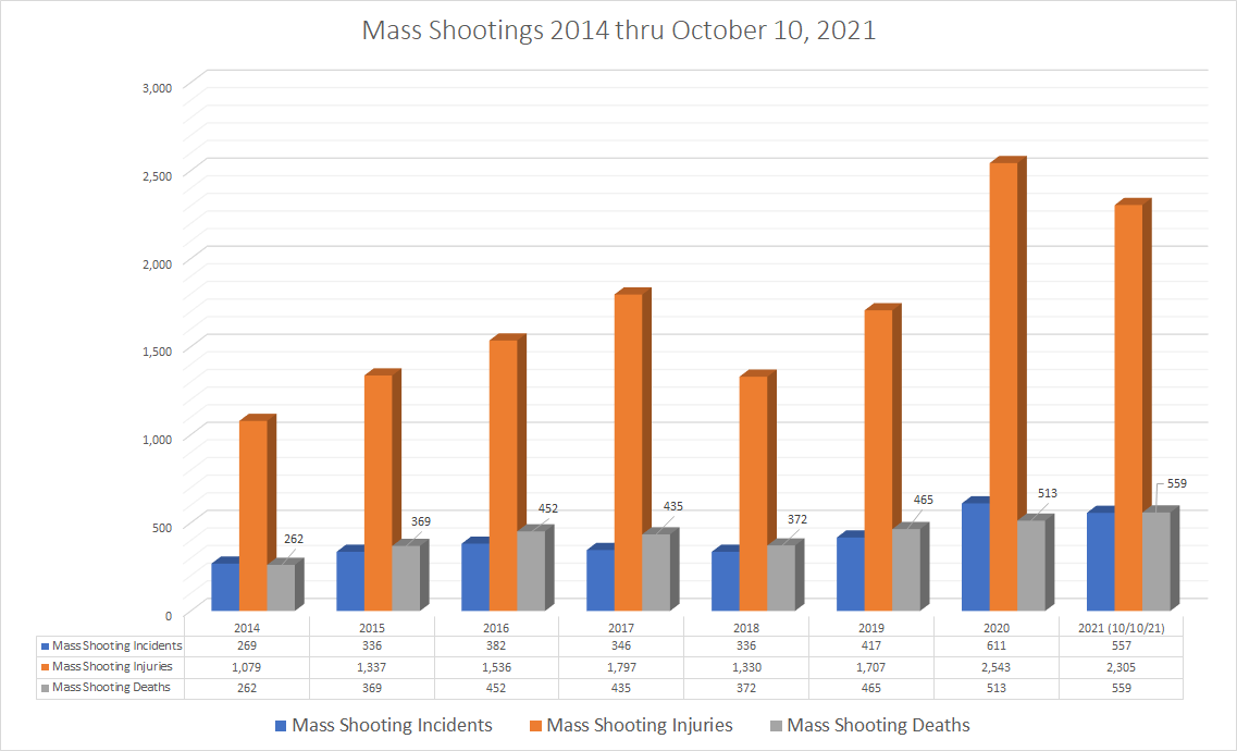 As of October 10, 2021, there have been 557 mass shooting incidents in the United States. In those incidents, 2,305 people were injured and 559 have been killed. While the number of incidents is down from 2020 (611 incidents), there are already 46 more deaths over 2020 and we still have 3 more months left in 2021. The data is show a concerning trend. While correlation does not always mean causation, it is noteworthy to be aware that, with the exception of 2017 and 2018, each successive year has been more deadly than the prior one. This is seemingly highlighting a disturbing trend.