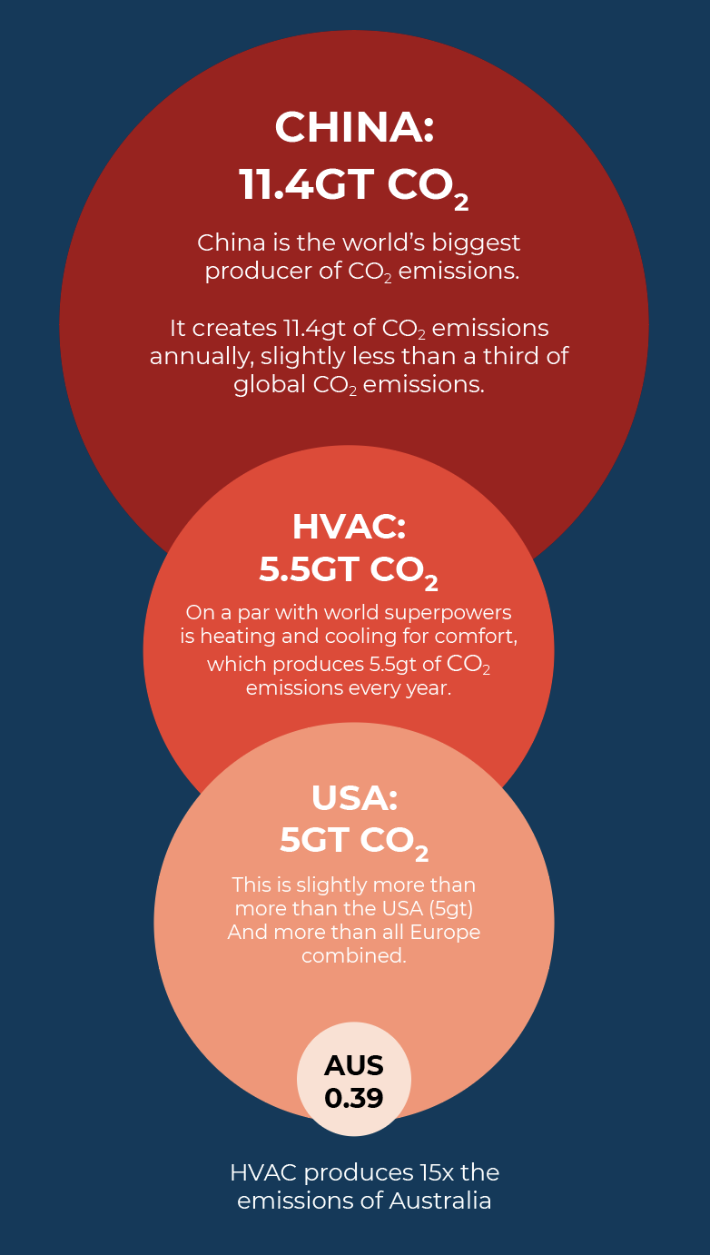 • The temperature and humidity controls in our homes and commercial buildings produce 5,500,000,000 tonnes of CO2 every year. This excludes the refrigeration of food/medicine, or industrial heating/cooling processes