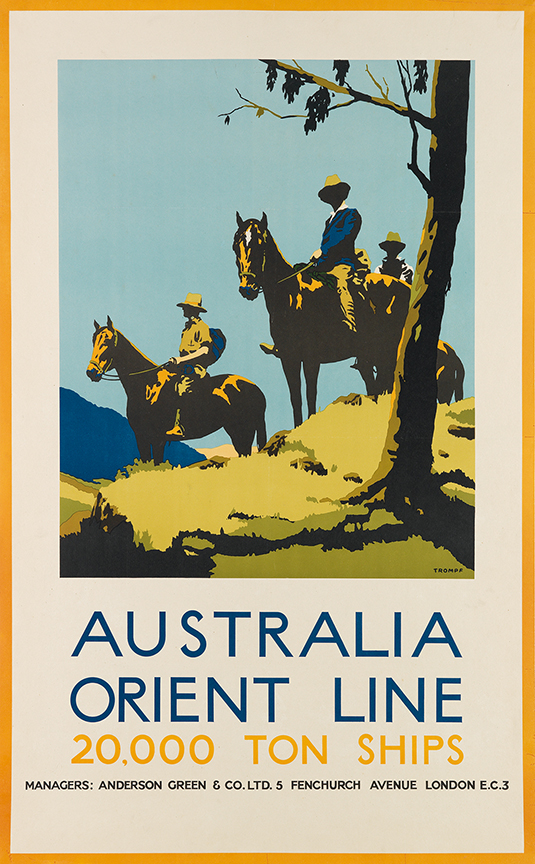 Two other Trompf designs are each estimated at $800 to $1,200. Australia Orient Line / 20,000 Ton Ships is undated, while Winter Holiday by Rail to Southern Australia is circa 1950s