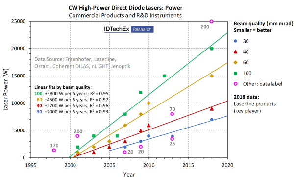 The evolution of output power and beam quality in high-power direct diode lasers (HPDDLs) at 1 micron infrared wavelength, according to data collected and analysed by IDTechEx. HPDDLs are a rapidly evolving tool for material processing and industrial manufacturing. Image source: IDTechEx