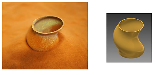 A pure copper object (left) 3D printed from a CAD model (right) using Shimadzu’s BLUE IMPACT diode laser. The lower half of the object is buried in copper powder. Image source: Shimadzu