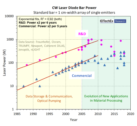 The increase in diode bar power contributed to the development of direct diode lasers and enabled new applications in material processing. The ongoing evolution of diode laser technology includes the improvement of infrared beam quality for precision engineering and the development of novel visible light lasers for metal processing. Image source: IDTechEx Research