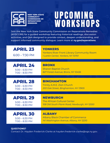 NEW YORK – THE NEW YORK / AGILITYPR.NEWS / April 23, 2026 / The New York State Community Commission on Reparations Remedies (NYSCCRR) will launch a free Community Educational Workshop Series beginning Wednesday, April 23, in Yonkers, with additional April sessions in the Bronx, Binghamton, Newburgh and Albany.