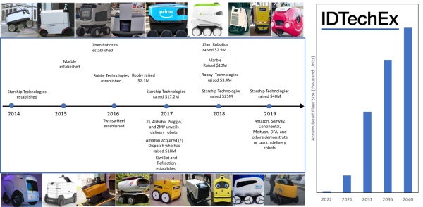 The timeline highlights various key events in the development of the sidewalk delivery business landscape between 2014 and 2019. The chart shows the accumulated fleet size of deployed robots- considering the replacement cycle- between now and 2040. By 2030, the market for hardware and delivery services will have reached one billion dollars. For more information please read “Mobile Robots, Autonomous Vehicles, and Drones in Logistics, Warehousing, and Delivery 2020-2040”.
