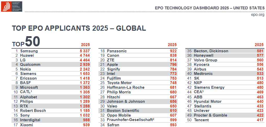 Companies and inventors from around the world filed a record 201 974 patent applications last year at the European Patent Office (EPO), according to the EPO Technology Dashboard 2025 (formerly Patent Index) published today. The U.S. maintained its position as the top country of origin for European patent applications, followed by Germany, China, Japan and Republic of Korea, with China rising to third place after a strong increase (+9.7%) in filings. American innovators filed 47,008 applications, a dip of -1.6% compared to 2024.