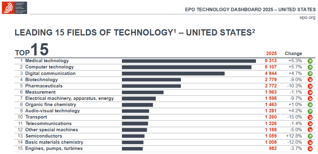 The leading fields of technology for U.S. applicants at the EPO reflect significant strengths in various high-growth industries. The top five in 2025 were: