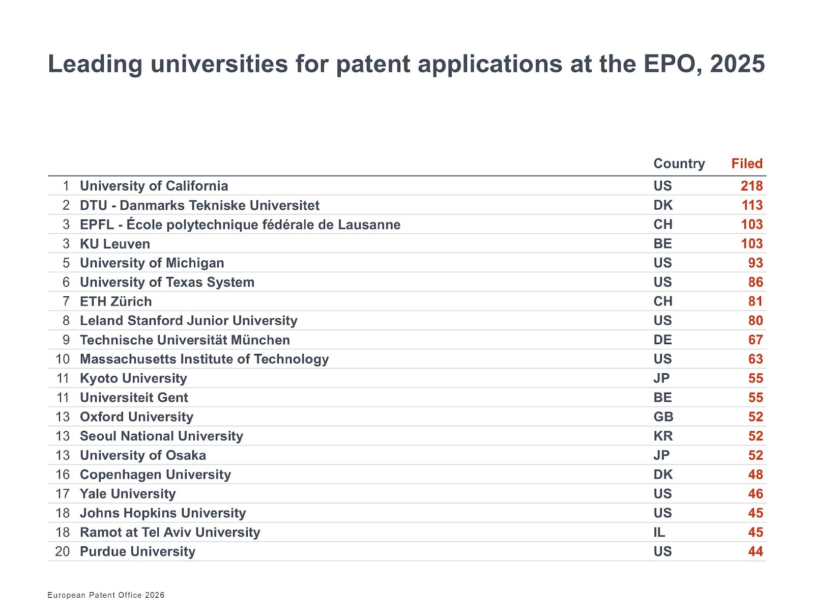 The excellence of U.S. research is also evidenced in the EPO ranking of universities by European patent applications. Eight of the leading 20 educational institutes are U.S.-based in 2025, with University of California topping the list.