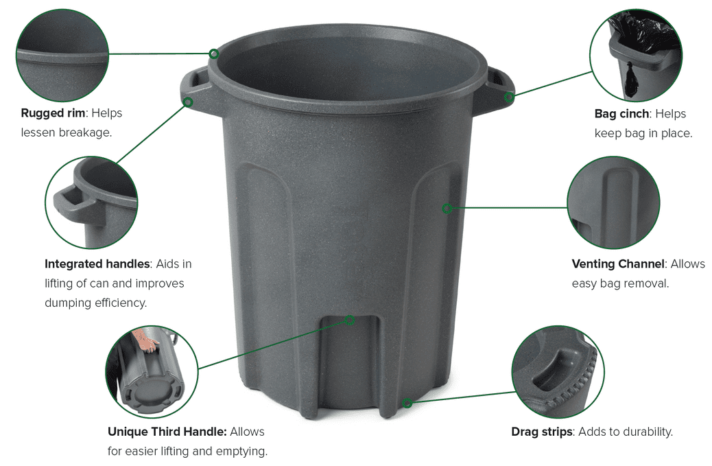 The Toter Round Can is built to increase efficiencies in a variety of work environments, including construction, foodservice, and janitorial settings. Ergonomically designed, it allows for increased mobility and helps its users transport heavy loads nearly effortlessly. The Toter Round Can increases load capacity, offers venting channels to enable easier bag removal with reduced suction, and has integrated top and mid handles, and a unique third bottom handle that allows for easier lifting and emptying.