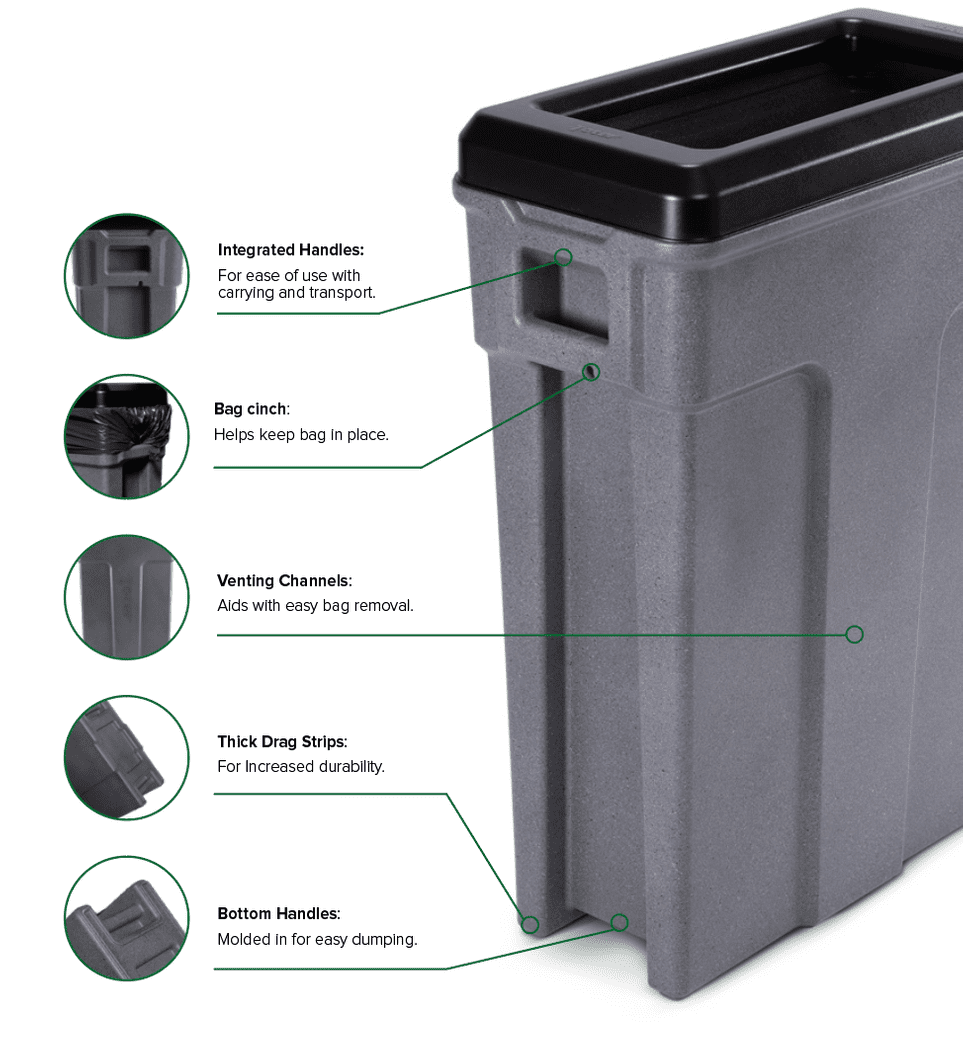 The Toter Slimline facilitates single-point trash collection by offering benefits not found in competing products. Its space-saving design provides a smaller footprint for a less-intrusive solution in any environment. Integrated handles allow for easy maneuvering, and a contoured base handles enhance control when dumping loads. Injury risk is reduced and productivity is enhanced by venting channels that allow for liners/bags to be easily removed. Various lid options also provide convenience for any application.
