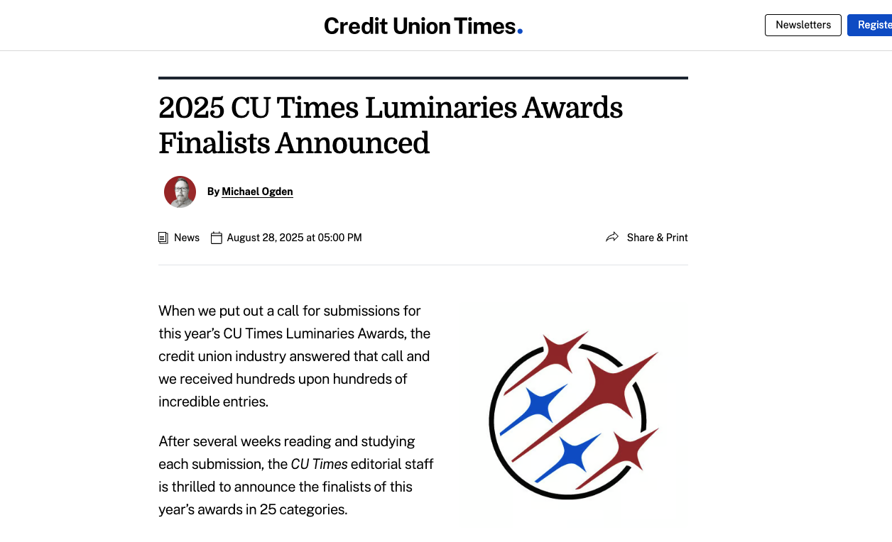 The CU Times Luminaries Awards celebrate credit unions and their leaders who drive meaningful impact in their communities and across the industry. Finalists were selected from a national field of entries by the CU Times editorial team. All finalists can be viewed here: https://www.cutimes.com/2025/08/28/2025-cu-times-luminaries-awards-finalists-announced/