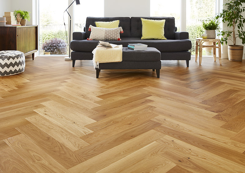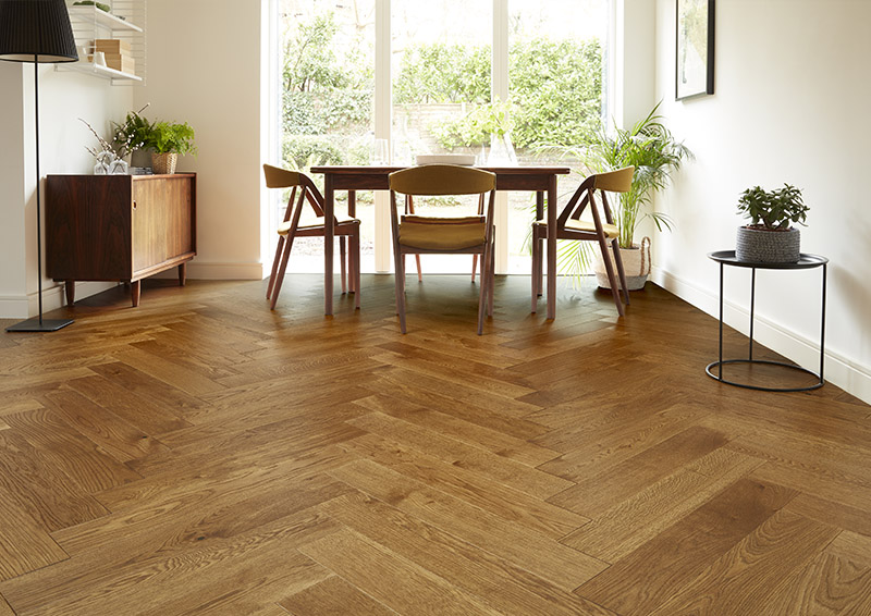Home Choice Herringbone Engineered European Select Oak Flooring 14mm x 130mm Caramel Lacquered, £48 per square metre.