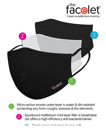 the facelet’s face covering consists of three layers. An anti-bacterial fabric filter sewn in. The filter is a non-woven polypropylene fabric that is commonly used in a wide variety of applications due to being lightweight having excellent breathability and barrier filtration capacity which helps to block bacteria from entering or exiting the mouth.