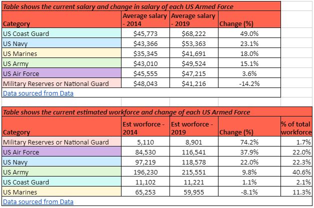 The US Coast Guard also plays a pivotal role in America’s war against crime, protecting sea borders from illegal activity such as drugs or people smuggling, a task that has grown more prominent and more dangerous in recent years. This is no doubt a driving factor behind the fact that the US Coast Guard not only offers the highest average salary of all US Armed Forces at $68,222 per year but it’s also seen the largest five-year growth at 49%.