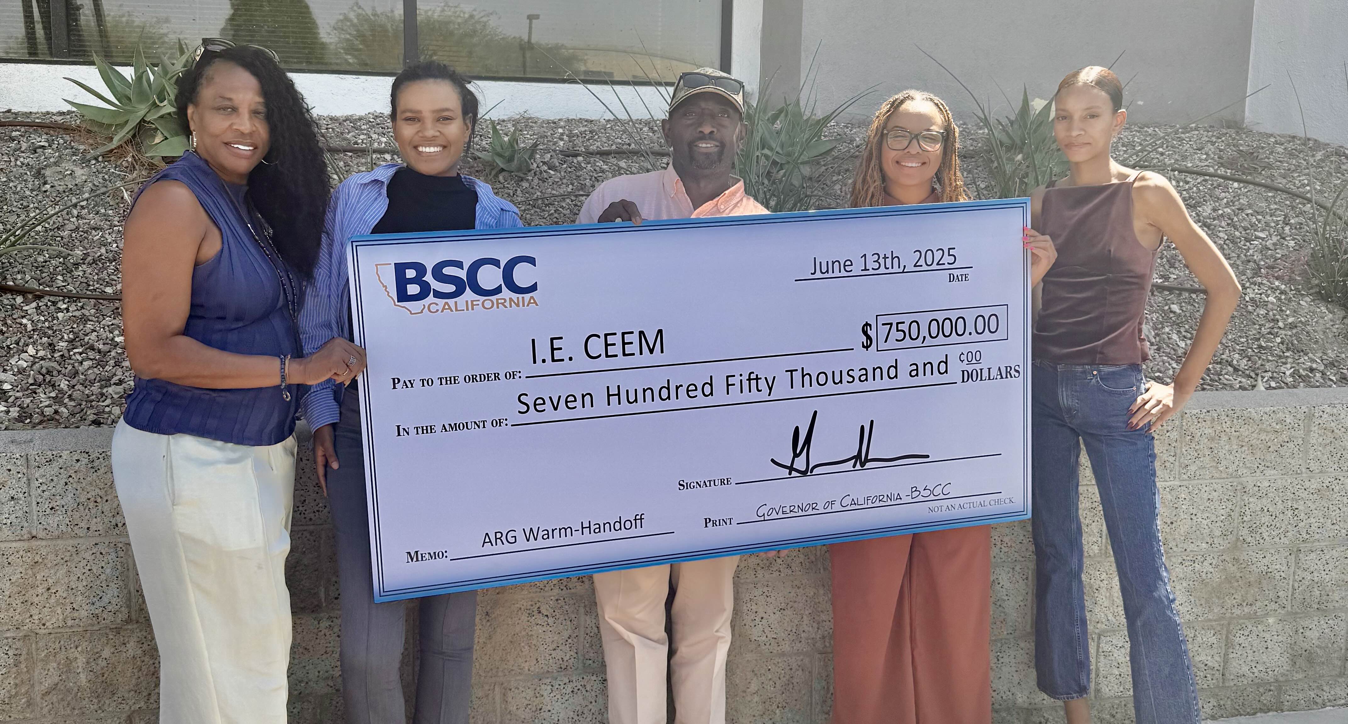 Photo Caption: Source Global Imagined presents a $750,000 check to I.E. CEEM from the Board of State Community Correction. From left to right in the photo: Luvina Beckley (Source Global Imagined Grant Fund Manager); Jade Knight (Executive Grants Director - MHM & Associates); George Lamb (Executive Director of I.E. CEEM); Monica Stockhouse (Project Coordinator - I.E. CEEM); Jordan Knight (Project Grants Administrator - MHM & Associates)