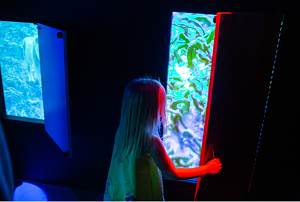 Alongside a touch-triggered 3D shapes memory game and luminous touch-sensitive pillars of light that all flash when the “master pole” is found, Digital Dimensions features three magical doorways. When opened they take visitors into a different virtual scene each time including a dive underwater with fish and aquatic life, a voyage into space and a trip to the wild full of lions and tigers. There are also glimpses of famous world landmarks.