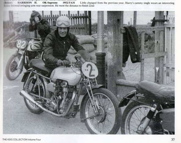 This 1935 OK Supreme RC37 250cc was much modified by the owner Henry Harrison from Liverpool after WW2 with rear swinging arm along with AMC suspension units and then entered into the 1951 Isle of Man TT by local Liverpool bike dealer Victor Horsman. Henry Harrison riding the bike, finished 14th in the lightweight class averaging 60mph.