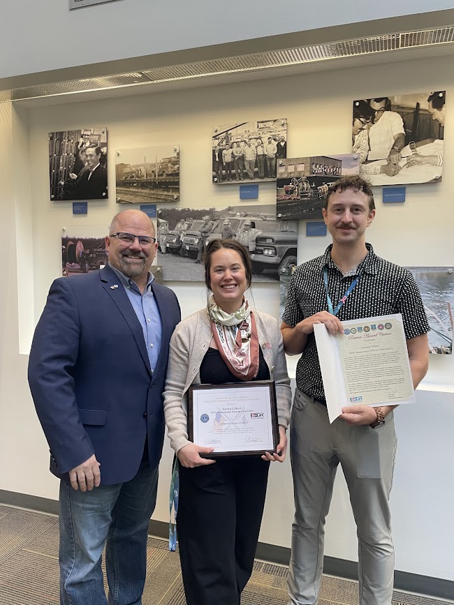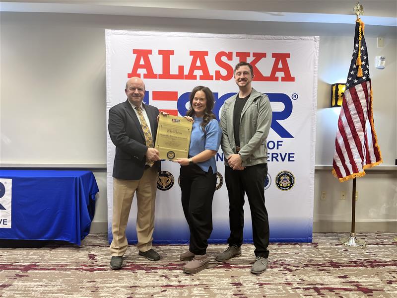 Robert Doehl (ESGR Alaska State Chair), Jessica Gilbert (MTA), and Staff Sgt. Alexander Medvedev (MTA/U.S. Army Reserve) accept the ESGR Pro Patria Award on behalf of MTA.