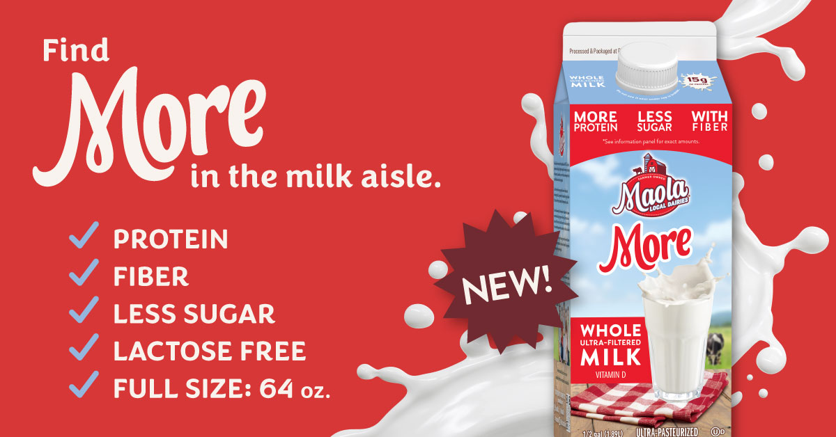 Maola Local Dairies™ announces the launch of Maola More™, a new line of ultrafiltered milks designed to deliver more of what today’s consumers are looking for — high protein, lower sugar, lactose free nutrition, and added prebiotic fiber for gut health benefits — all in a larger, more affordable half gallon format.