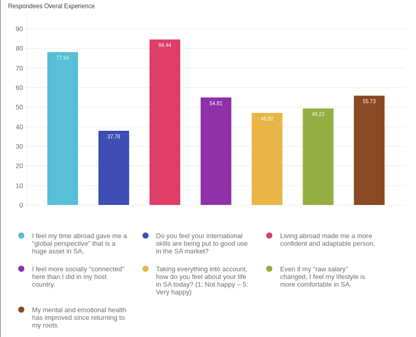 One of the strongest findings is the impact of international exposure on personal development and professional outlook. Respondents consistently indicated that living abroad broadened their worldview and strengthened their adaptability. Half of the respondents strongly agreed that their time abroad gave them a global perspective that is now a valuable professional asset in South Africa, producing an average rating of 4.19 out of 5 for the value of international perspective. The survey also recorded its highest rating for personal development, with respondents scoring the statement that living abroad made them more confident and adaptable at an average of 4.41 out of 5.