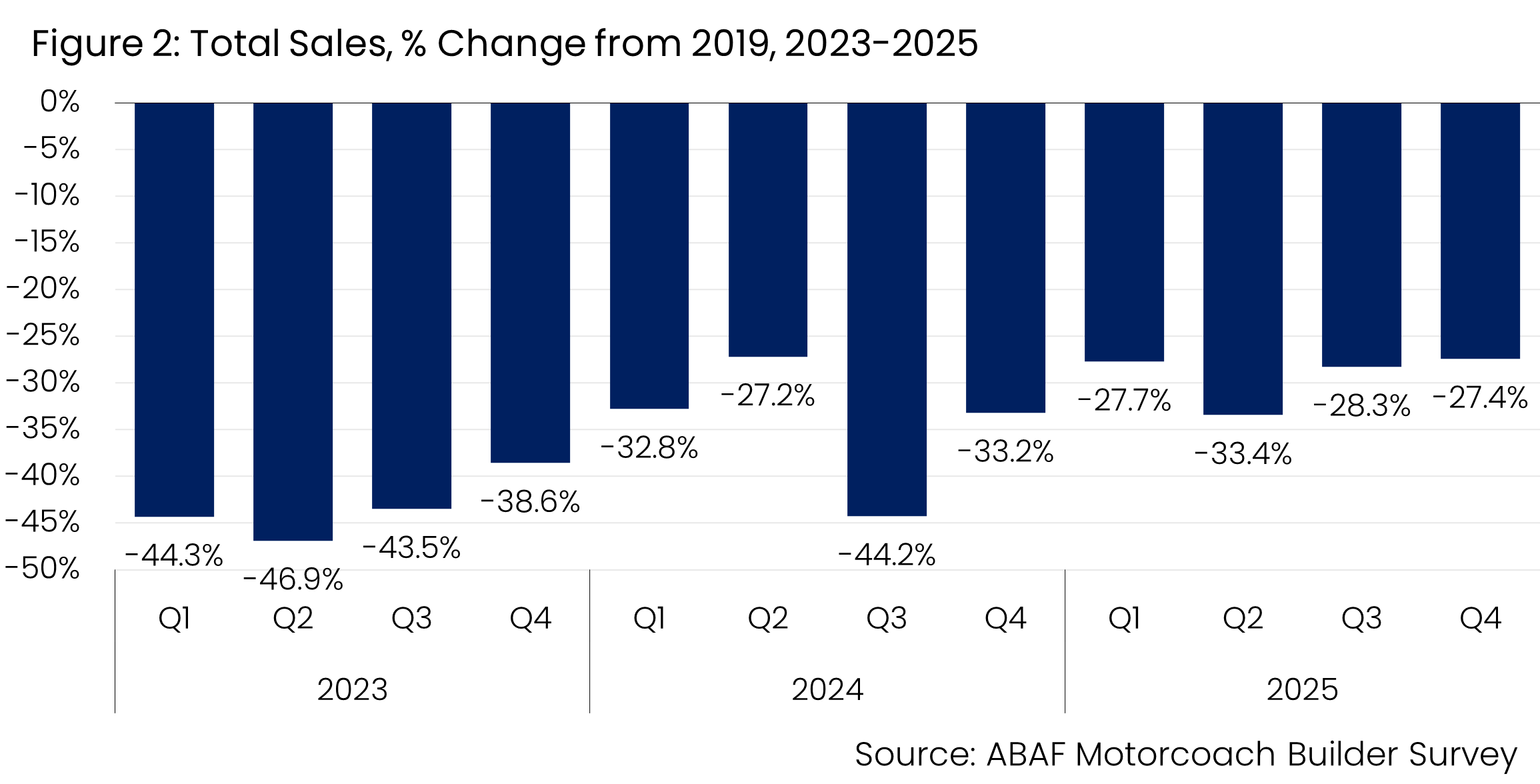 This quarter, the participating manufacturers sold 657 new and 85 pre-owned coaches, for a total of 742 motorcoaches. This compares with 683 during the fourth quarter of 2024 (Figure 1). The year-over-year increase reflects continued replacement demand as operators modernize fleets that were held longer during the pandemic and supply-chain disruptions. Despite this improvement, fourth-quarter 2025 sales remain 27.4% below the same quarter in 2019, underscoring that overall volumes are still below long-term growth expectations (Figure 2). Taken together, the data point to cautious forward momentum rather than a broad-based expansion, with operators preparing for major international events while prioritizing reliability, safety, and cost control in purchasing decisions.