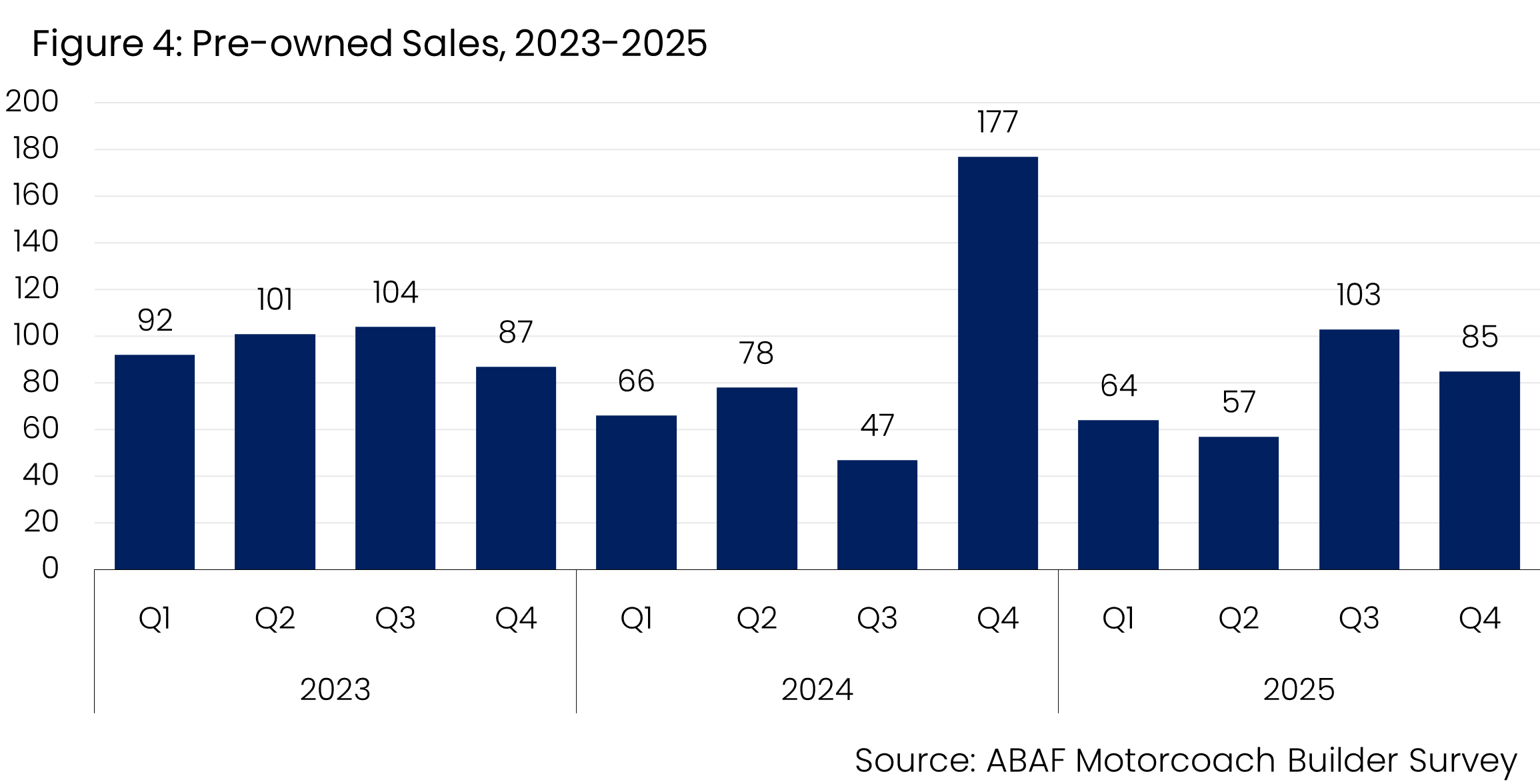 Sales of new motorcoaches have increased by 29.8% compared to the same quarter in 2024, with the sale of pre-owned motorcoaches 52.0% lower (Figures 3 and 4). The sharp divergence between new and pre-owned sales underscores the evolving cost dynamics facing the industry. While new motorcoach purchases accelerated as operators sought to lock in pricing and delivery timelines, the decline in pre-owned sales suggests tightening availability and rising prices in the secondary market. Together, these trends point to a market balancing near-term affordability concerns against the need for long-term fleet efficiency and compliance.