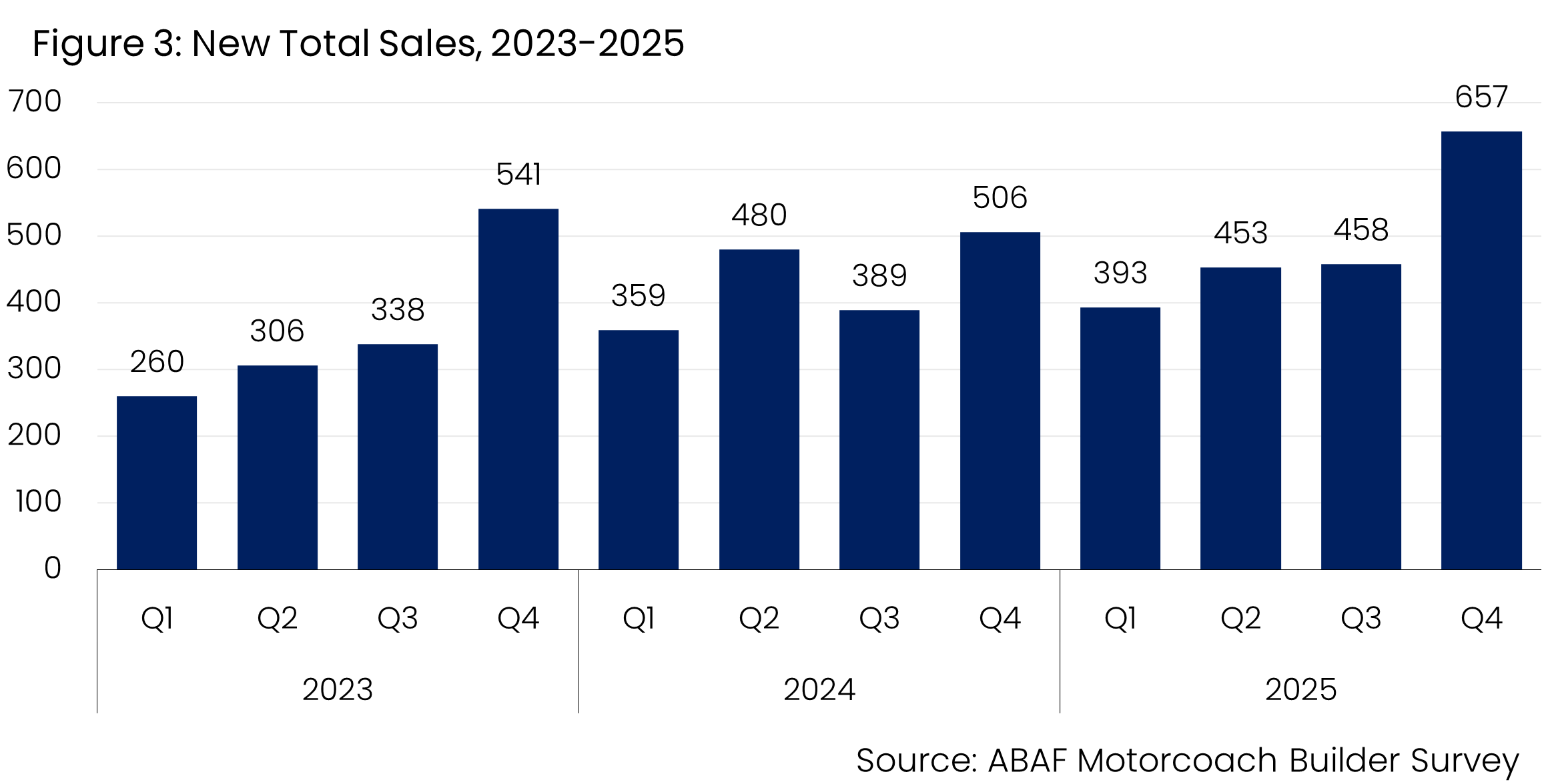 Looking ahead, sustained recovery in the motorcoach market will depend on predictable trade policy, manageable financing conditions, and continued investment in domestic manufacturing capacity. While sales are approaching pre-pandemic benchmarks, prolonged cost pressures could constrain future fleet renewal and slow the adoption of newer, safer, and more efficient technologies without supportive policy and economic conditions.