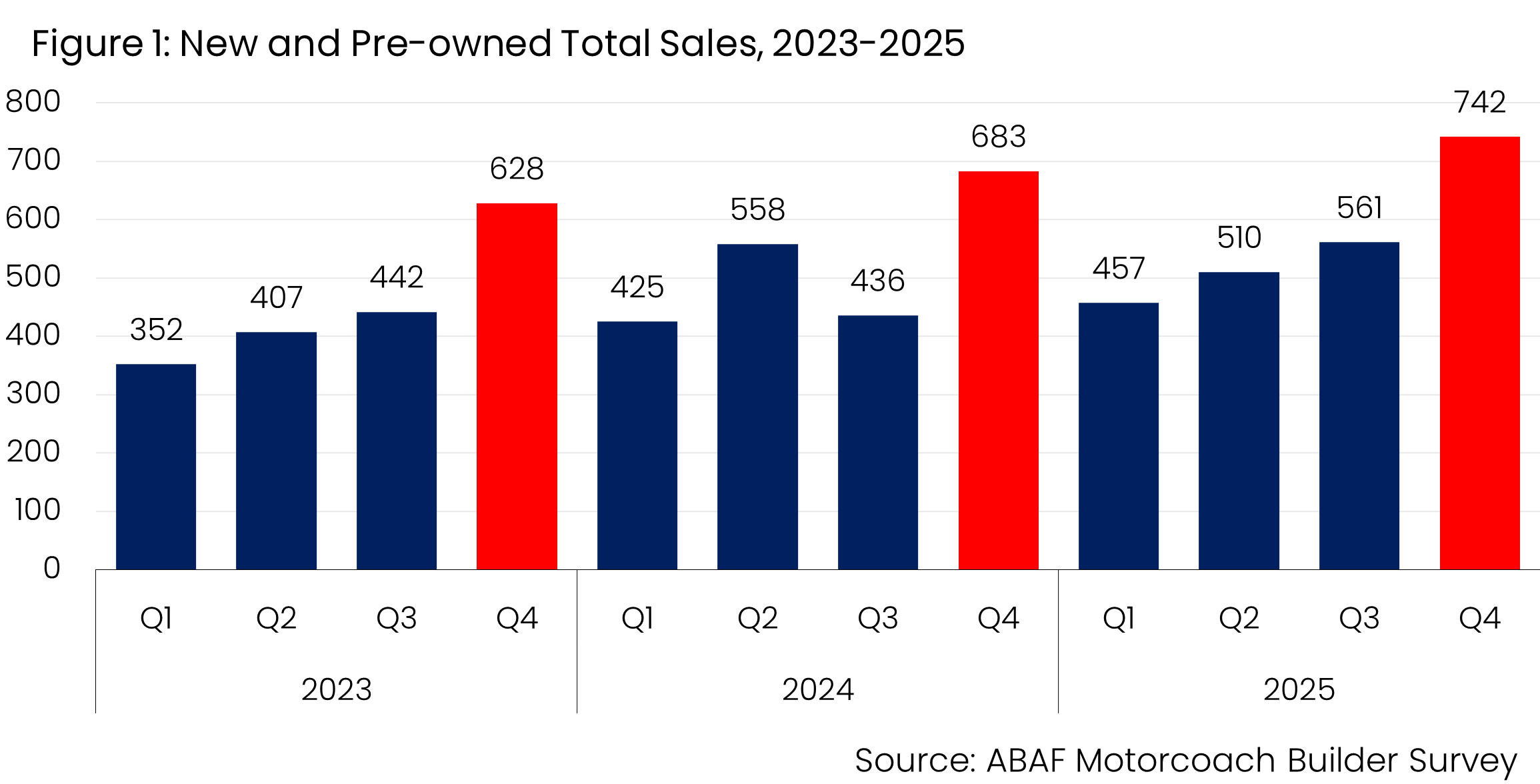 The American Bus Association (ABA), the leading voice in North America’s charter bus, motorcoach, group travel and tourism industries, today announced the Fourth Quarter 2025 Motorcoach Builders Survey. The survey, which is produced by the ABA’s research arm, the American Bus Association Foundation, produces the report each quarter with data collected from surveys of the major motorcoach manufacturers that sell vehicles in the United States and Canada.