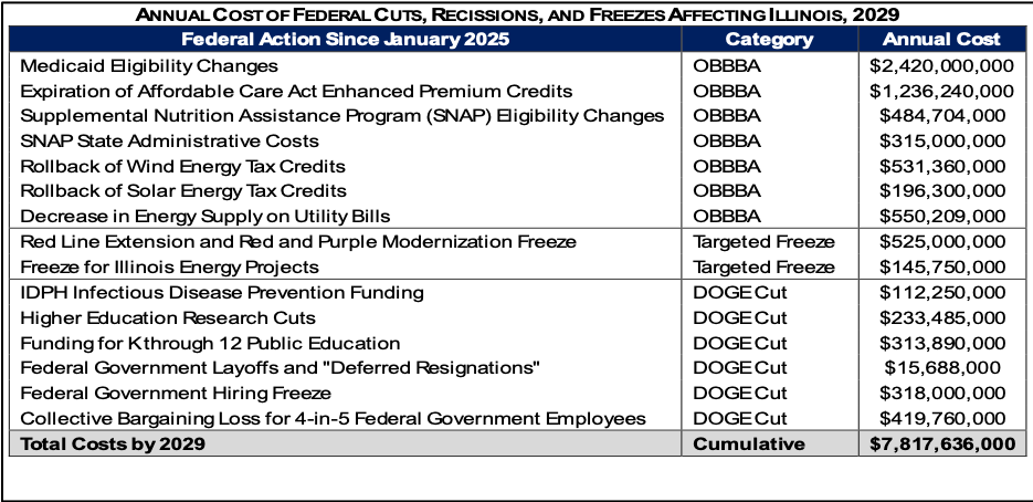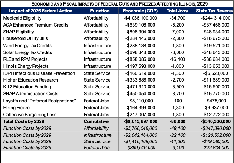 By the end of President Trump’s term, the wave of project cancellations, funding recissions, mass federal firings, and cuts to public health, nutrition, infrastructure, education, and other programs enacted by the administration in 2025 will amount to nearly $8 billion annually in lost revenue and increased out-of-pocket expenses, shrink the economy by $10 billion per year, and cost the state 86,000 jobs—according to a new analysis by the nonpartisan Illinois Economic Policy Institute (ILEPI) and the Project for Middle Class Renewal (PMCR) at the University of Illinois at Urbana-Champaign. The report also finds that these actions will cause hundreds of thousands of Illinois residents to lose access to health insurance coverage and food assistance, while shrinking state tax collections by more than $1 billion per year.