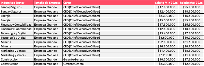 De acuerdo con la tabla de sueldos C-suite incluida en la Guía Salarial, el cargo mejor remunerado del mercado chileno es el CEO de una gran compañía minera, con un rango que va de $22,8 millones a $31,1 millones líquidos mensuales. Le siguen los CEOs de banca, seguros, energía y finanzas, que pueden llegar a los $25,9 millones líquidos en empresas de gran tamaño.
