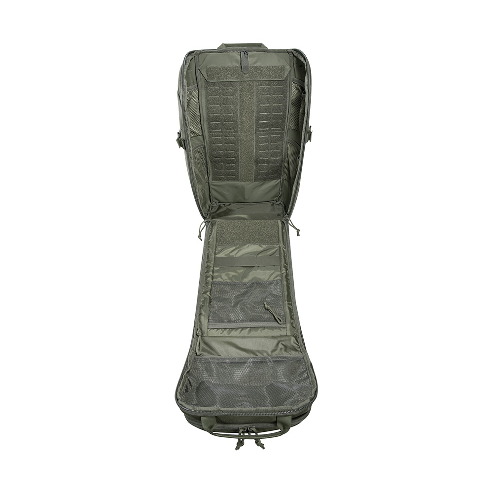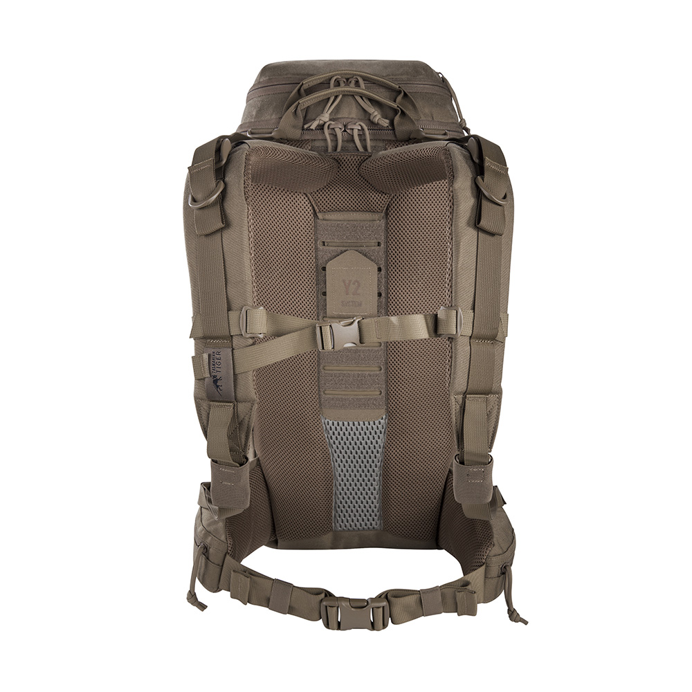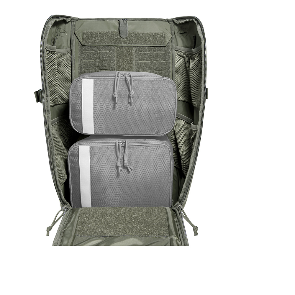 The ergonomically padded back panel integrates aluminum support elements for enhanced load transfer and rigidity. A detachable rear panel with a shapeable aluminum rail allows users to customize the pack’s structure to mission-specific requirements. Length-adjustable shoulder straps and padded hip fins with zippered pockets, removable via hook-and-loop attachment, further enhance adaptability and load management.