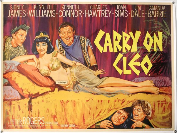 One of two examples displayed as evidence in the court case itself, the Tom Chantrell design for Carry On Cleo (1964), starring Sid James, Kenneth Williams and Amanda Barrie, set out to parody the Hollywood epic Cleopatra of the year before, starring Elizabeth Taylor and Richard Burton, just as Carry On Cleo itself was a spoof of the Hollywood film.