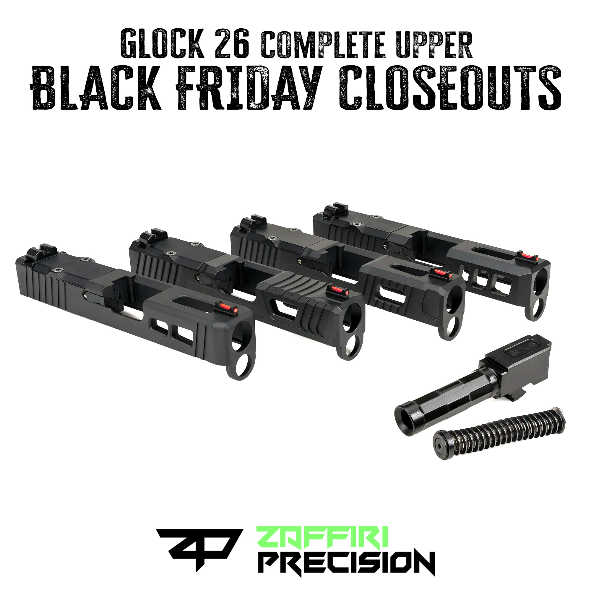 The headline offer includes the last remaining Glock 26 complete upper assemblies ever to be produced by Zaffiri Precision. Formerly priced at $500, these fully built, ready-to-install uppers are now available for just $249 while supplies last. Once this inventory is sold out, Glock 26 upper production will cease permanently.